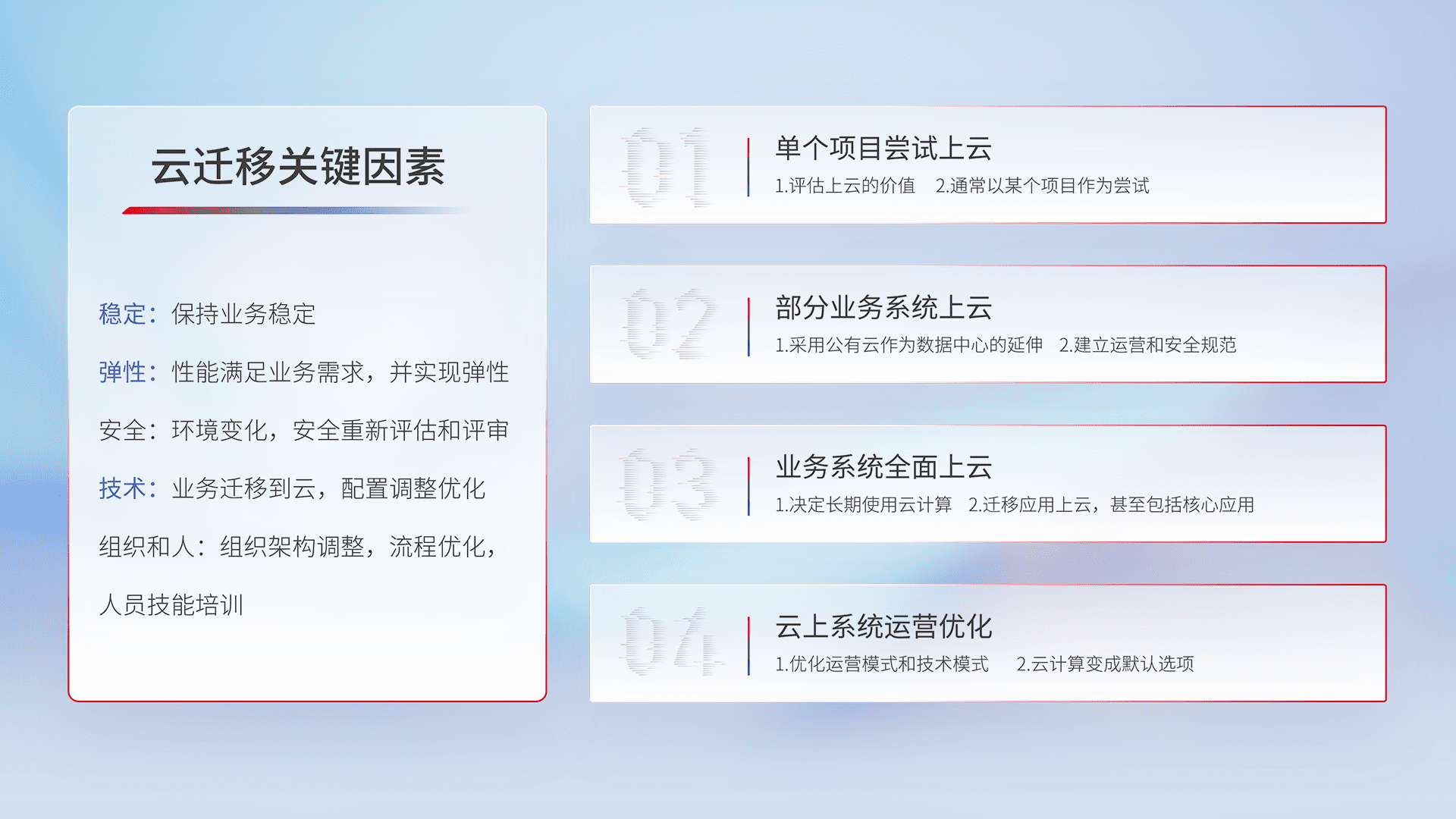 结合实际业务,,从规划设计、、、云平台选型、、、、云原生改造、、、数据迁移、、、集成交付,,迁移全过程为客户识别最佳上云路径,,做好风险识别管理,,,设计网络架构、、身份权限、、安全审计合规、、、、操作审计、、、日志审计、、、监控告警策略、、多站点容灾设计等,,,,对云上基础设施进行整体规划,,,,提升IT治理水平,,以满足弹性、、、高可用、、、高性能的需求。。。