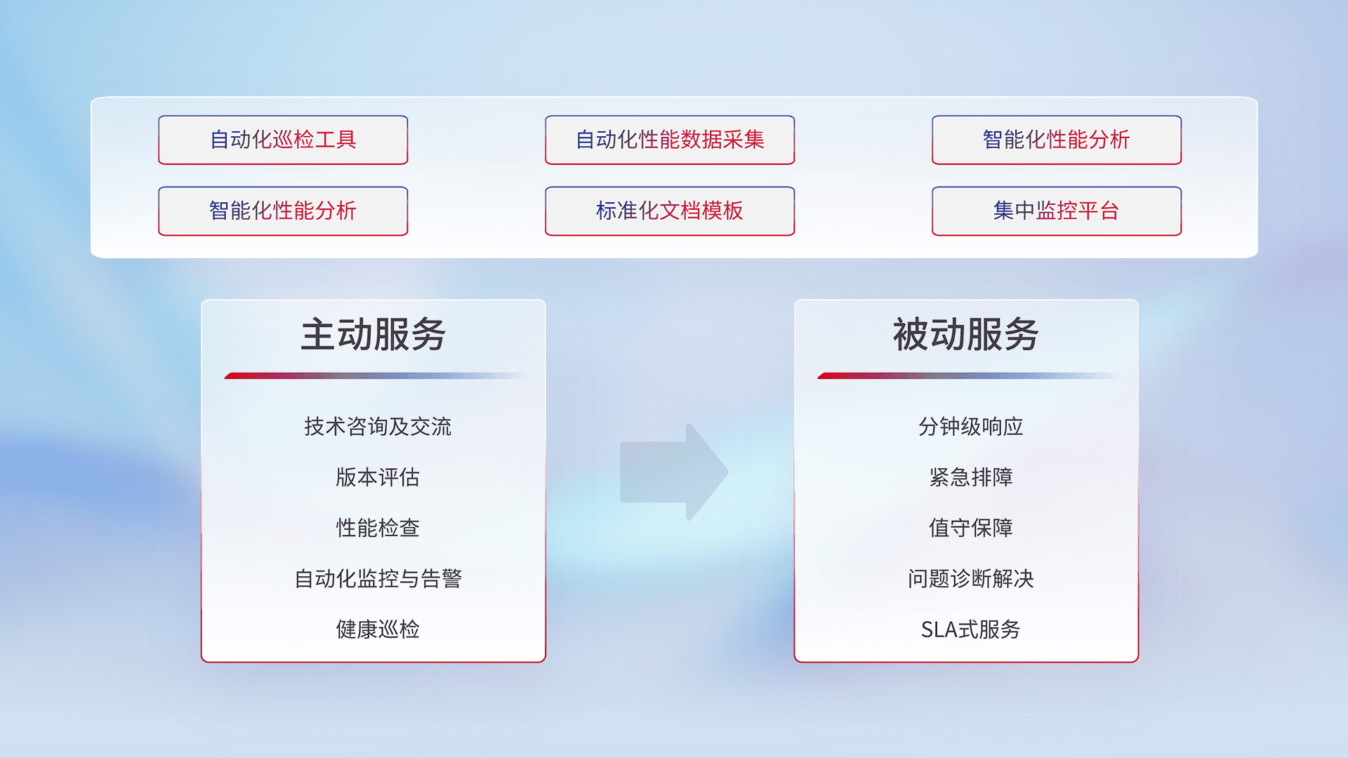 智能化工具和标准化文档,,,,保障服务质量,,提供主动服务(包含技术咨询、、、、版本评估、、、、性能检查、、自动化监控与告警、、健康巡检)和被动服务包含(分钟级响应、、、紧急排障、、、值守保障、、问题诊断解决、、、SLA服务)。。。。