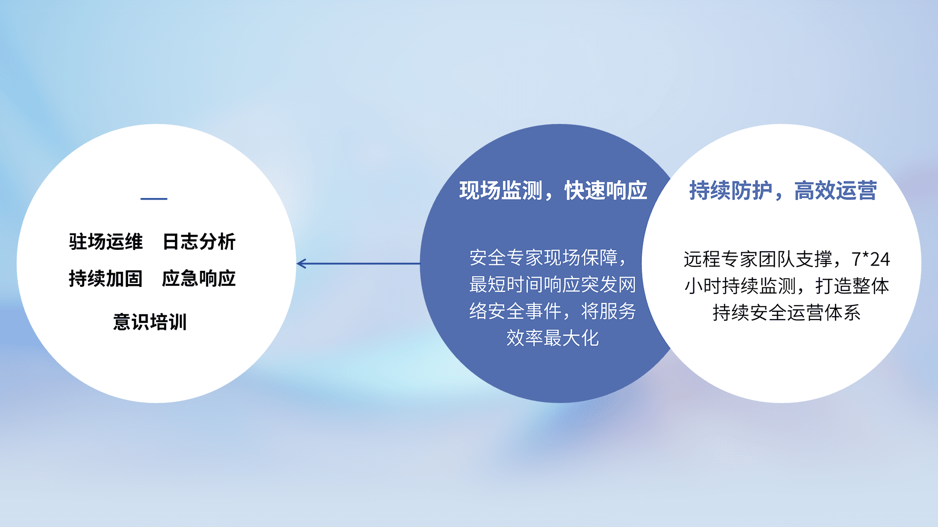 针对客户行业特性,,,,以专业的安全服务+多厂商联合解决方案提供专属的一站式安全管理服务,,,帮助客户全面感知网络空间威胁,,基于识别、、、检测、、分析、、防护、、监测、、、、响应的服务理论模型,,,,从方案咨询、、、、集成交付、、、、评估验证、、、优化加固、、、、运维运营,,,致力于为客户提供完整的闭环管理式安全服务。。。。以实战经验为客户打造高抵御风险的安全体系,,,帮助客户发现威胁、、对抗威胁、、处置威胁,,,不断积累安全对抗能力,,,持续保障数字化安全。。。