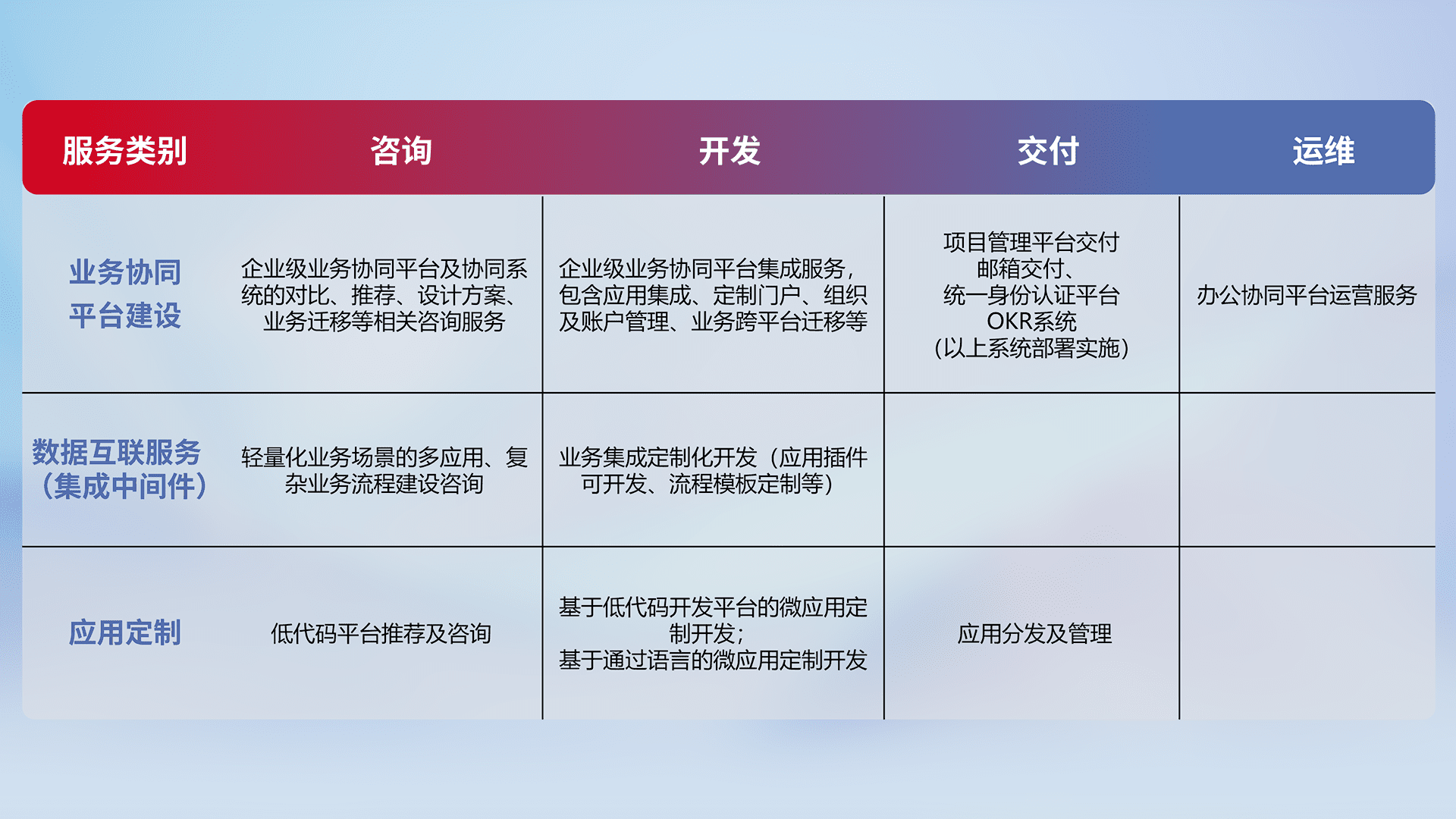 针对钉钉、、、、企微、、、IDaas等平台级产品提供产品的规划、、、、方案、、、交付、、、、定制化开发等服务,,,实现如统一协同办公、、、智能客户服务、、、、混合会议管理、、、智能数据查询、、、、等业务场景,,,,实现数字化转型。。
